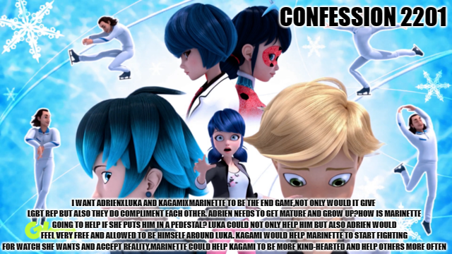 “i want adrienxluka and kagamixmarinette to be the end game,not only would it give lgbt rep but also they do compliment each other. Adrien needs to get mature and grow up?how is marinette going to help if she puts him in a pedestal? luka could not only help him but also adrien would feel very free and allowed to be himself around luka. kagami would help marinette to start fighting for watch she wants and accept reality,marinette could help kagami to be more kind-hearted and help others more often”