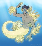 The first pic has Mer!Rhys wondering why this human has metal pieces stuck on his face. Jack just wants to hunt some fish to eat. // The second pic shows Mer!Jack, which I quickly drew right after finishing the first one, probably spotting and/or luring his next meal. Don’t get distracted by his glowing and glittering golden scales; he’s poisonous..!—Edit: I forgot to add gills lmao.